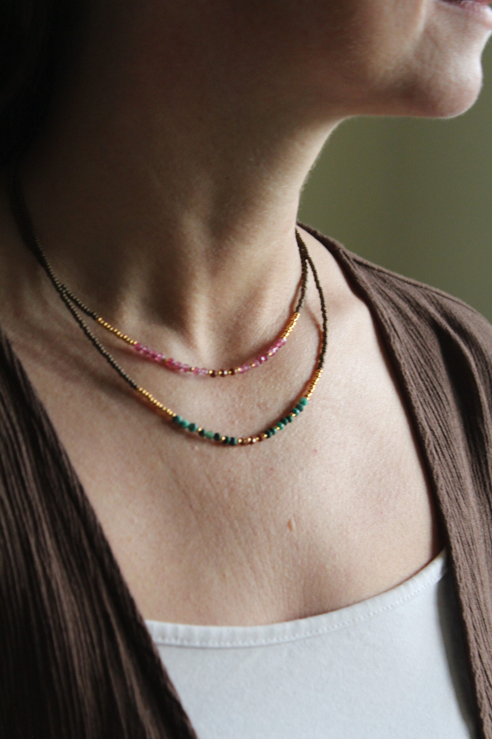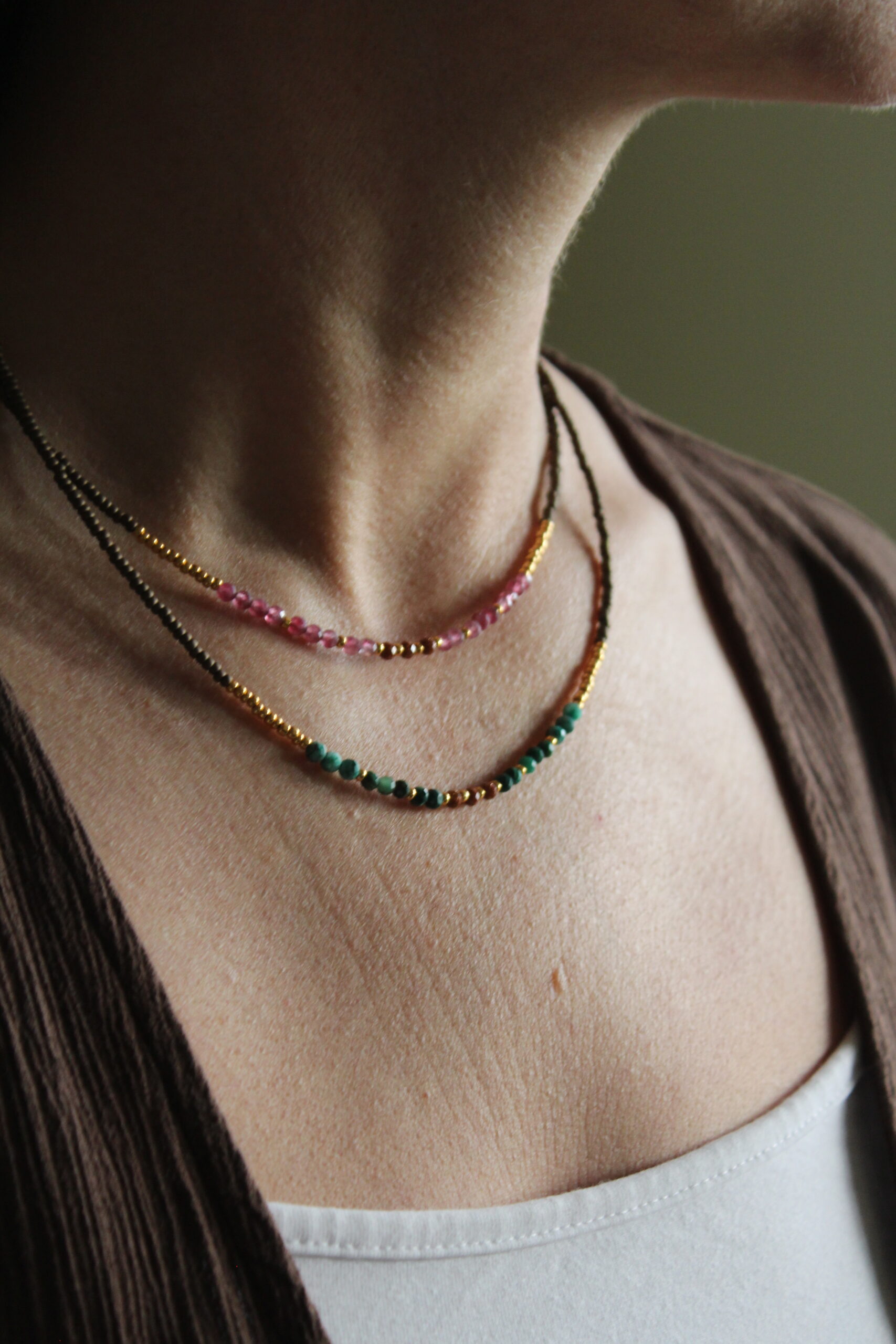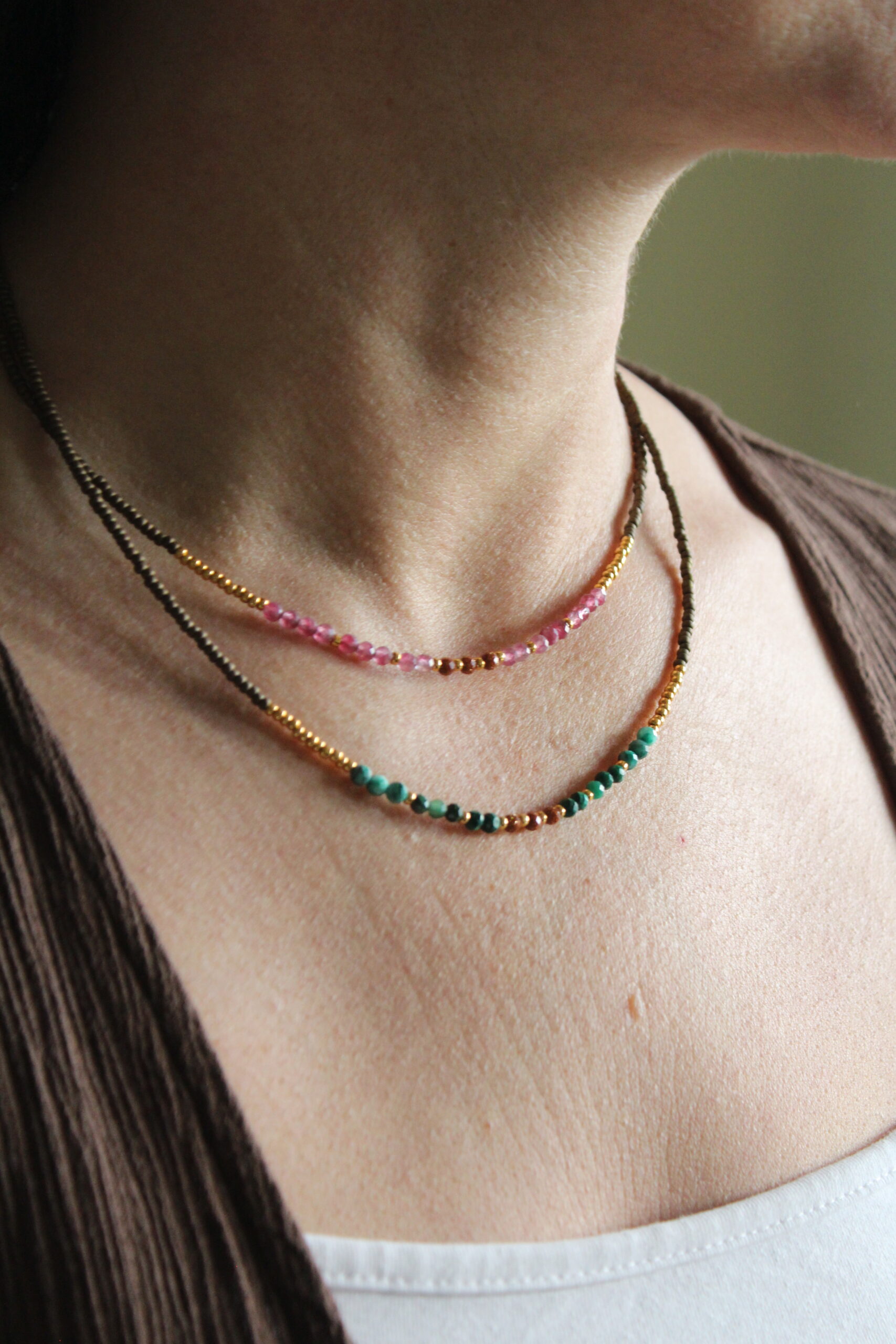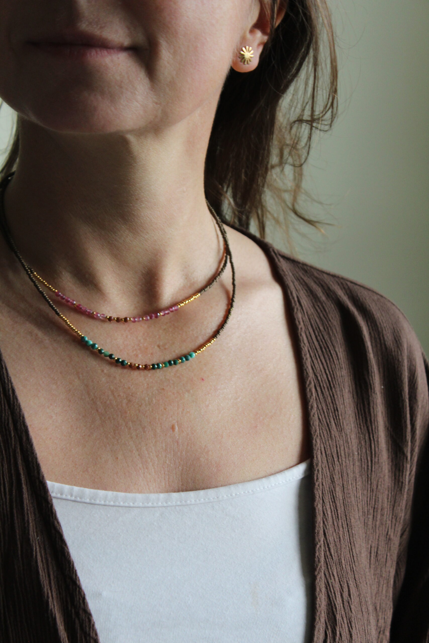 Podwójny naszyjnik ze szklanych koralików w kolorze brązowo złotym z kamieniami naturalnymi :