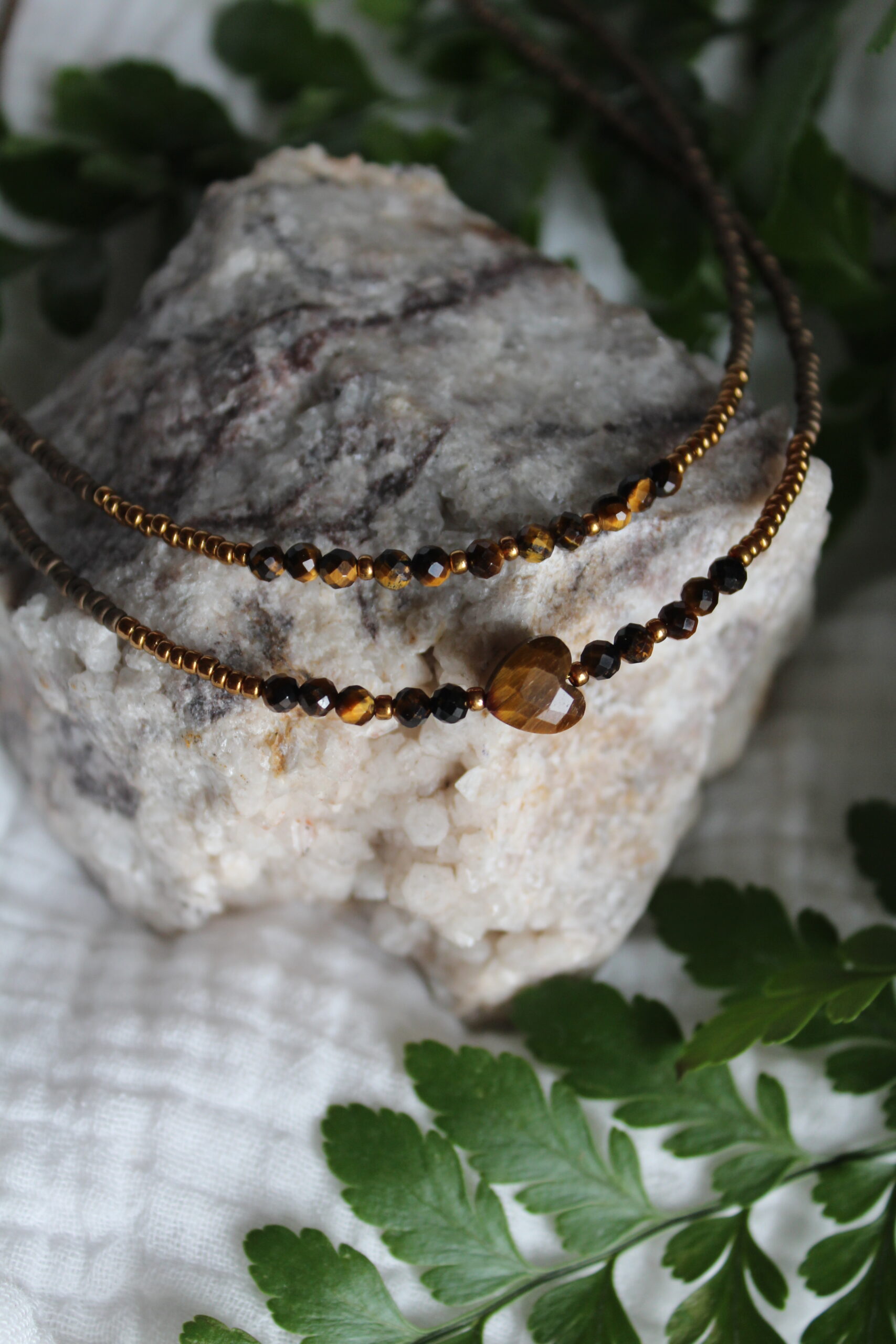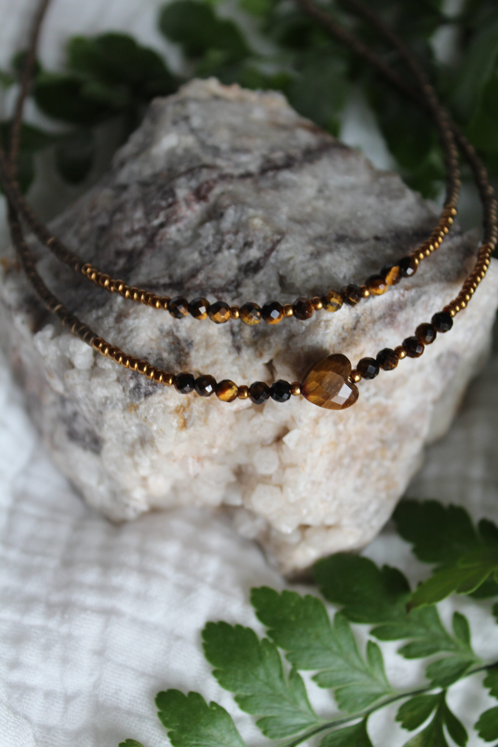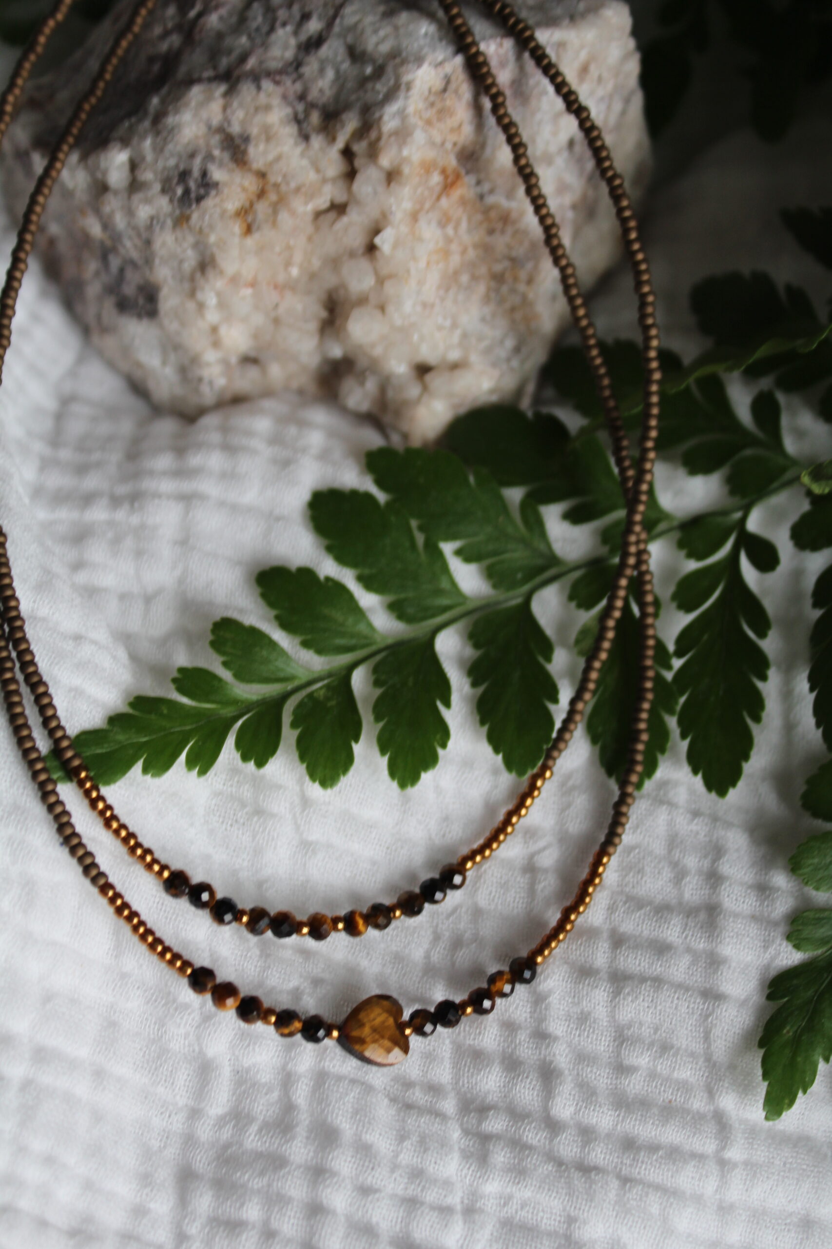 Podwójny naszyjnik wykonany ze szklanych koralików oraz naturalnych kamieni tygrysiego oka, uzupełniony centralnym sercem z kamienia. Ciepłe, ziemiste odcienie tworzą harmonijną kompozycję, która emanuje spokojem i naturalną elegancją.